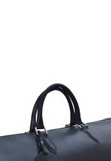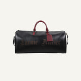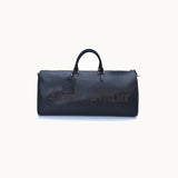 Cowhide duffle bag in black with tone on tone logo printed at front. Burnished edges in black. Twin rolled leather carry handles at top. Detachable and adjustable webbing shoulder strap with lobster clasp fastening. Bumper studs at base. Zip closure. Zippered pocket and patch pockets at interior. faux suede lining. Silver-tone hardware. Tonal leather name tag, sheathed keys on detachable leather lanyard, and lock in silver-tone included. Approx. 60 cm.