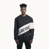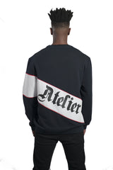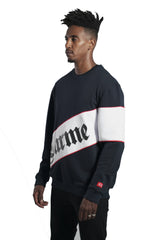 Long sleeve french terry sweater in navy blue white and red, logo printed at front and back.