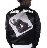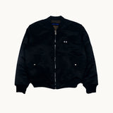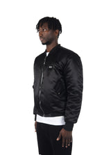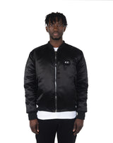 Long sleeve insulated viscose and cotton-blend satin bomber jacket in black. Rib knit stand collar, cuffs, and hem. Zip closure at front. Flap pockets at waist. Lamb skin text appliqué in white and patch at back Viscose satin lining in green. Fully lined.