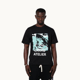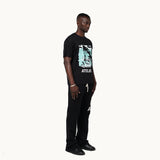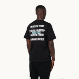 Short sleeve cotton jersey T-shirt in black. Rib knit crewneck collar. Text printed in multicolour at front and at back .