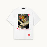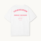 Short sleeve cotton jersey T-shirt in white. Rib knit crewneck collar. Text printed in multicolour at front and neon pink at back .