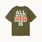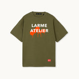 Short sleeve cotton jersey T-shirt in olive green. Rib knit crewneck collar. Text printed in white and orange at front and at back .