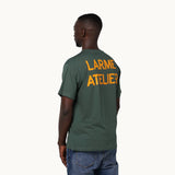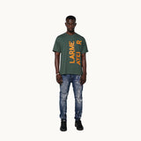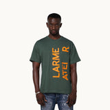 Short sleeve cotton jersey T-shirt in green. Rib knit crewneck collar. Text printed in orange at front and at back .