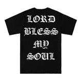Short sleeve cotton jersey T-shirt in black. slightly oversized Rib knit crewneck collar. Text printed in white at back and multicolour graphic printed at front.