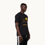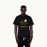 Short sleeve cotton jersey T-shirt in black. Rib knit crewneck collar. Text printed in yellow at front and at back .