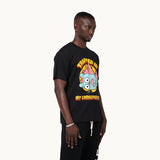 Short sleeve cotton jersey T-shirt in black. Rib knit crewneck collar. Text printed in multicolour at front and at back .