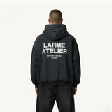 Constructed from heavyweight premium french terry cotton, the oversized silhouette provides a relaxed drape with a structured feel. Each piece features subtle destroyed detailing and faded tones, giving every hoodie a unique, .One of a kind vintage hoodie Finished with signature LARME ATELIER branding , this hoodie is built for everyday wear, layering, and statement styling.