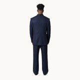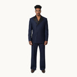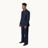 Crafted from premium wool, the blazer features a structured silhouette with sharp lapels and a classic double-breasted front with a satin collar , finished with a hidden polished buttons for a refined touch. The rich navy hue adds depth and versatility, making it a standout yet sophisticated choice. Matching flared pants elongate the legs with their clean lines and tailored fit, offering a sleek contrast to the strong structure of the blazer. Together, the set strikes a perfect balance between modern flair and vintage-inspired charm — ideal for making a powerful impression at work or any upscale event.