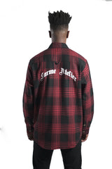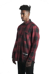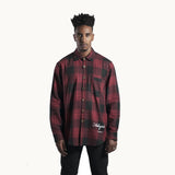 Short sleeve cotton flannel shirt checkered in red and black. Logo printed in white at back. Signature logo printed at back.
