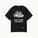 Short sleeve cotton jersey T-shirt in black. Rib knit crewneck collar. Text printed in white at front and at back .